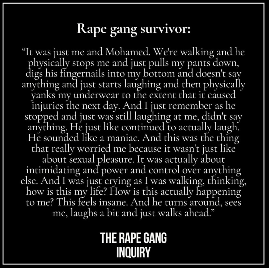 “It was just me and Mohamed. We’re walking and he physically stops me and just pulls my pants down, digs his fingernails into my bottom and doesn’t say anything and just starts laughing and then physically yanks my underwear to the extent that it caused injuries the next day. And I just remember as he stopped and just was still laughing at me, didn’t say anything. He just like continued to actually laugh. He sounded like a maniac. And this was the thing that really worried me because it wasn’t just like about sexual pleasure. It was actually about intimidating and power and control over anything else. And I was just crying as I was walking, thinking, how is this my life? How is this actually happening to me? This feels insane. And he turns around, sees me, laughs a bit and just walks ahead.”